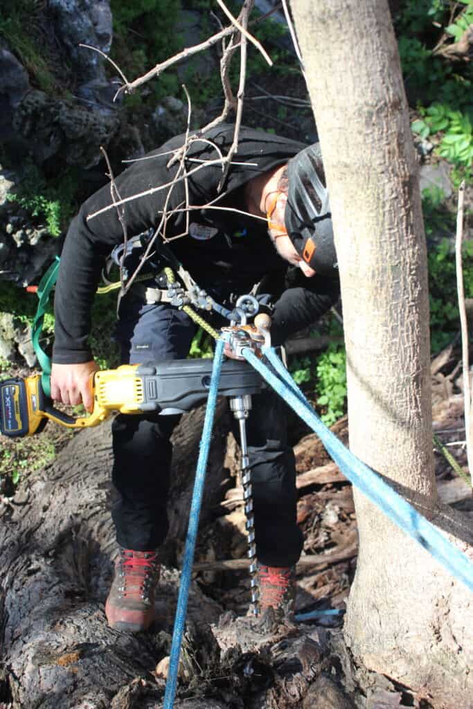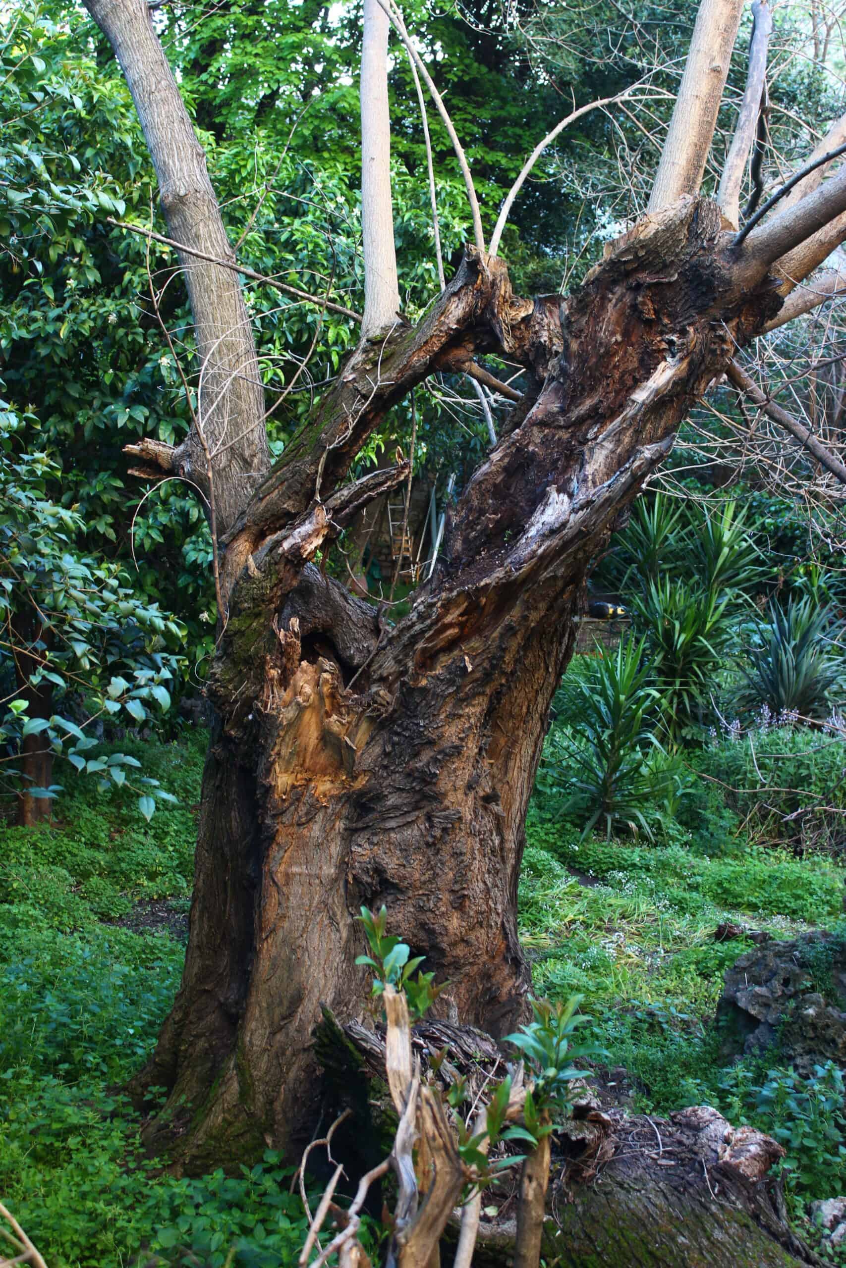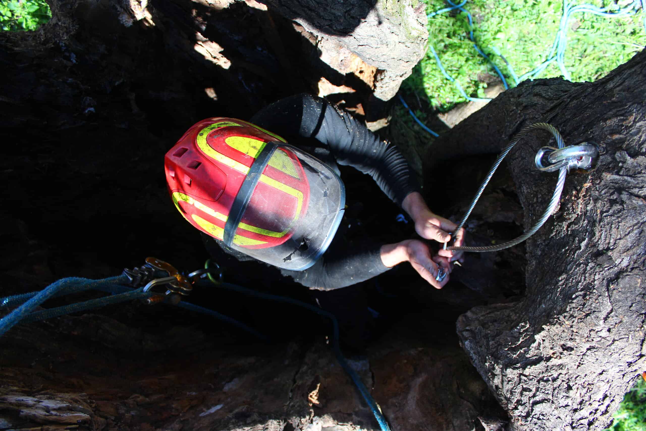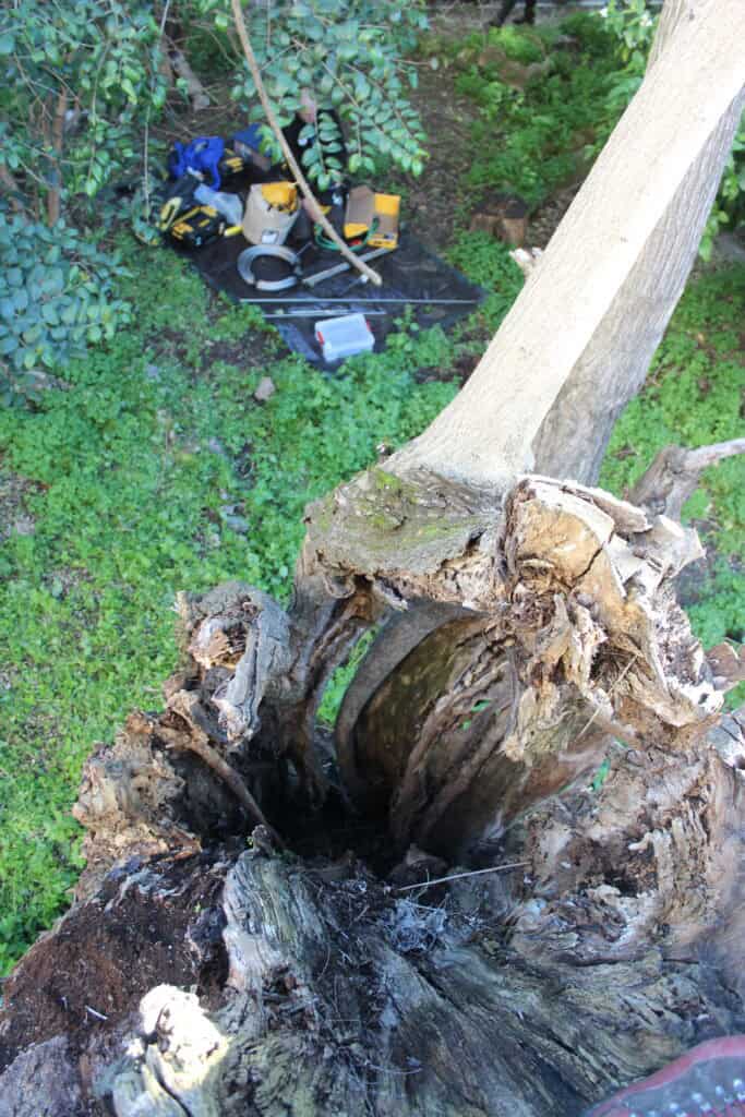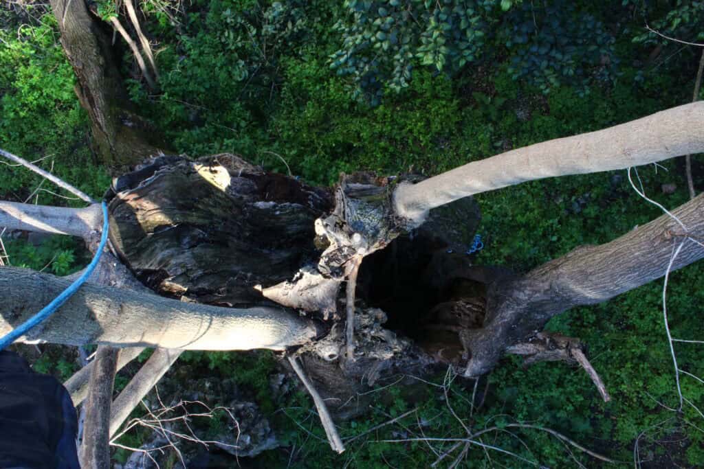On note la quantité de Dendro-Micro-Habitats sur ce genre de vieux sujet. On cherche les zones de PRBS les plus épaisses (Paroie Résiduelle de Bois Sain) pour la pose des différents ancrages.