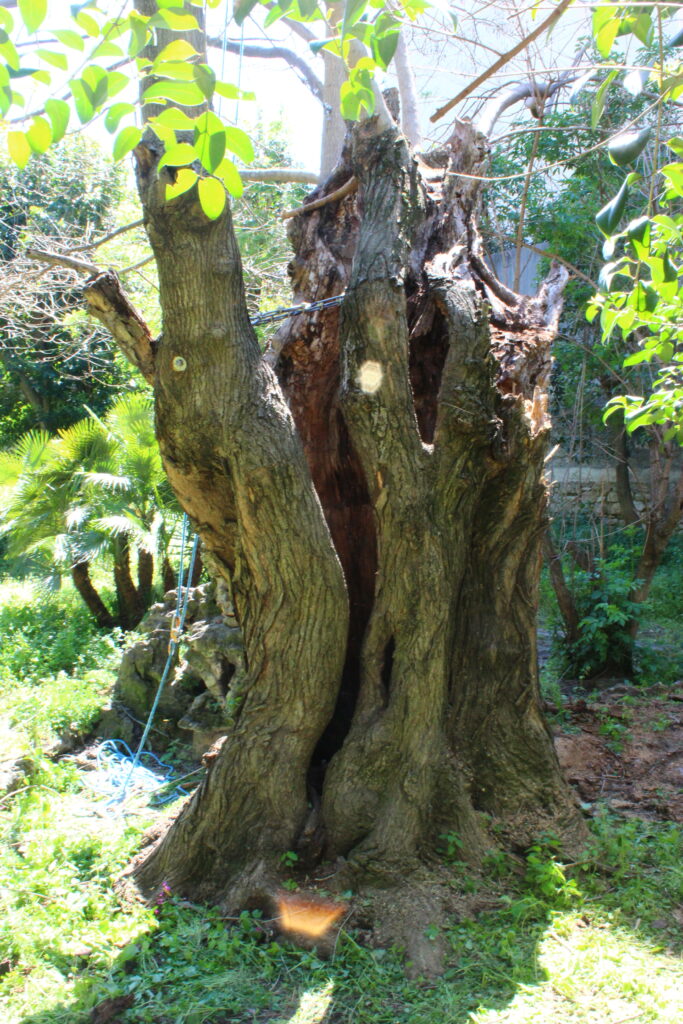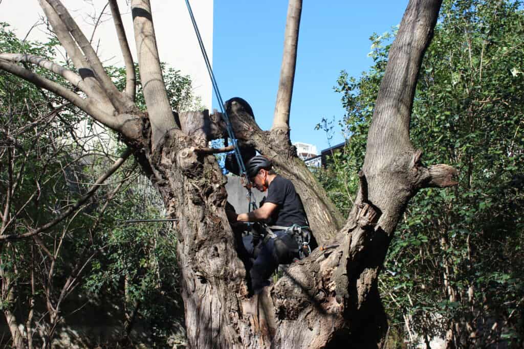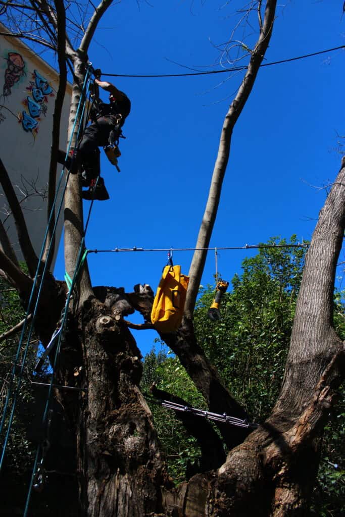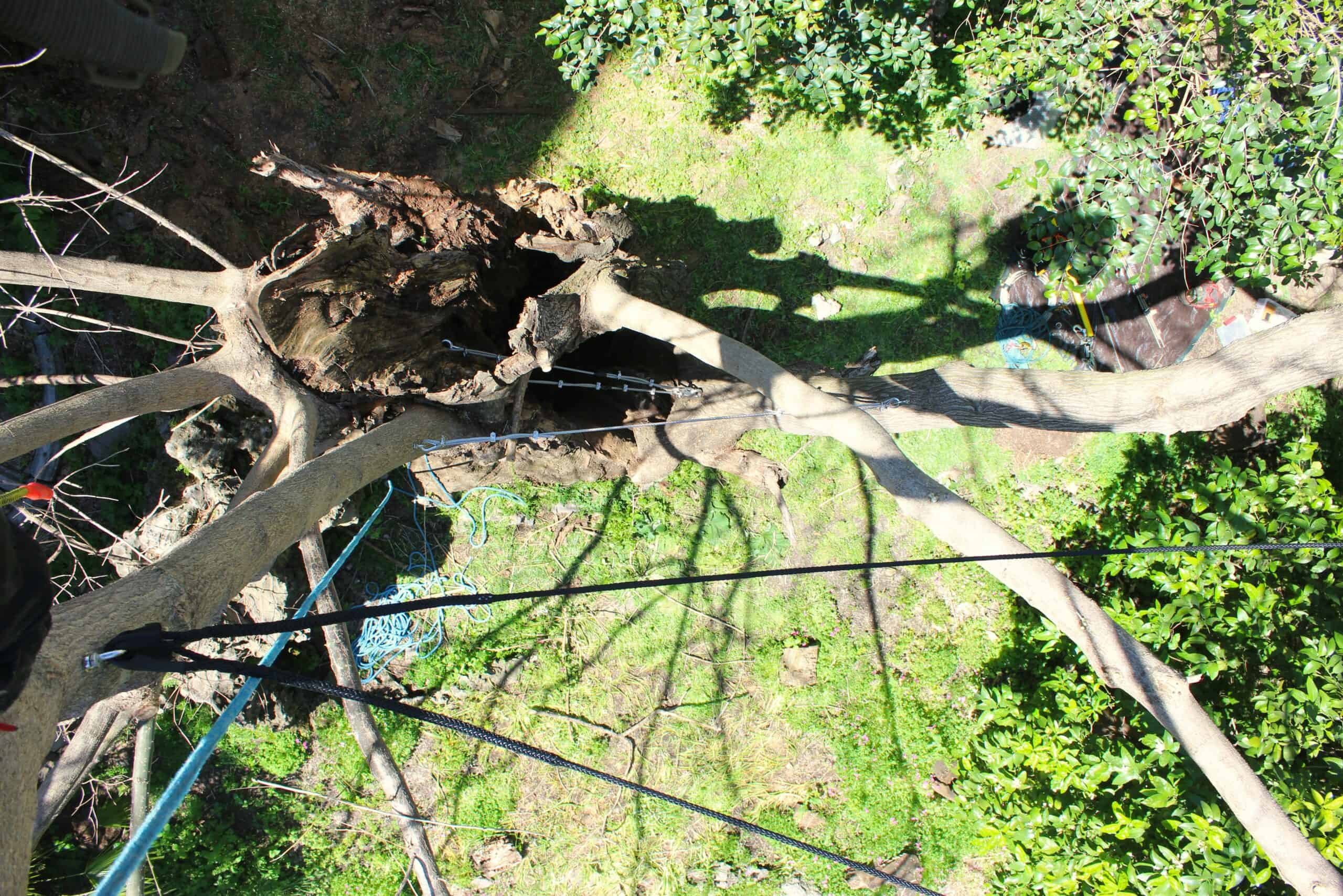 Suite à la rupture d’une branche charpentière sur ce vieux Sophora d’un jardin caché du cœur de ville (Montpellier), pose d’un système de haubanage actif et passif. Une ancienne verrière est une « cible » d’une des sections restantes.