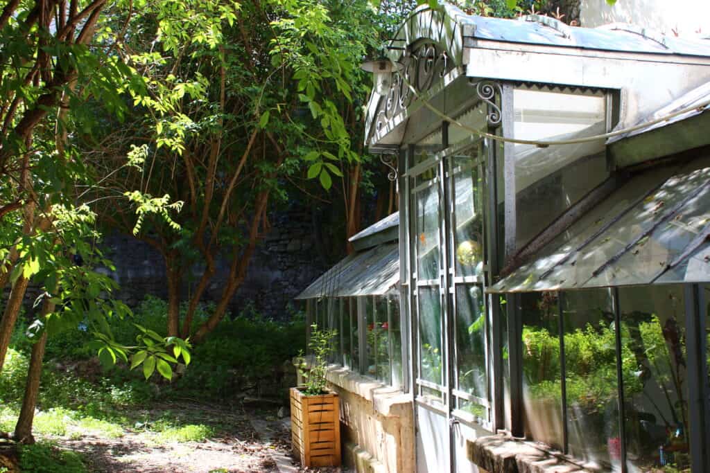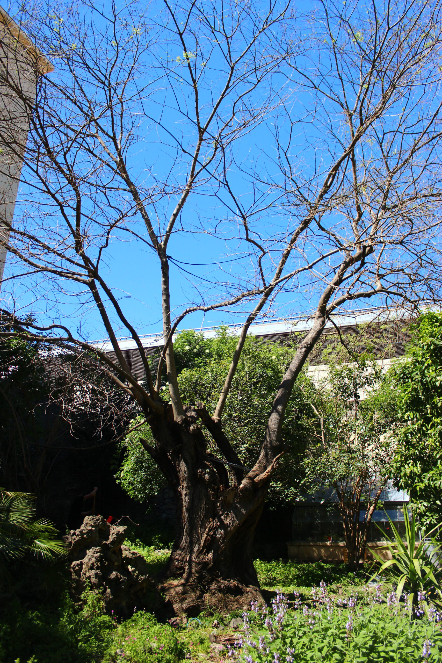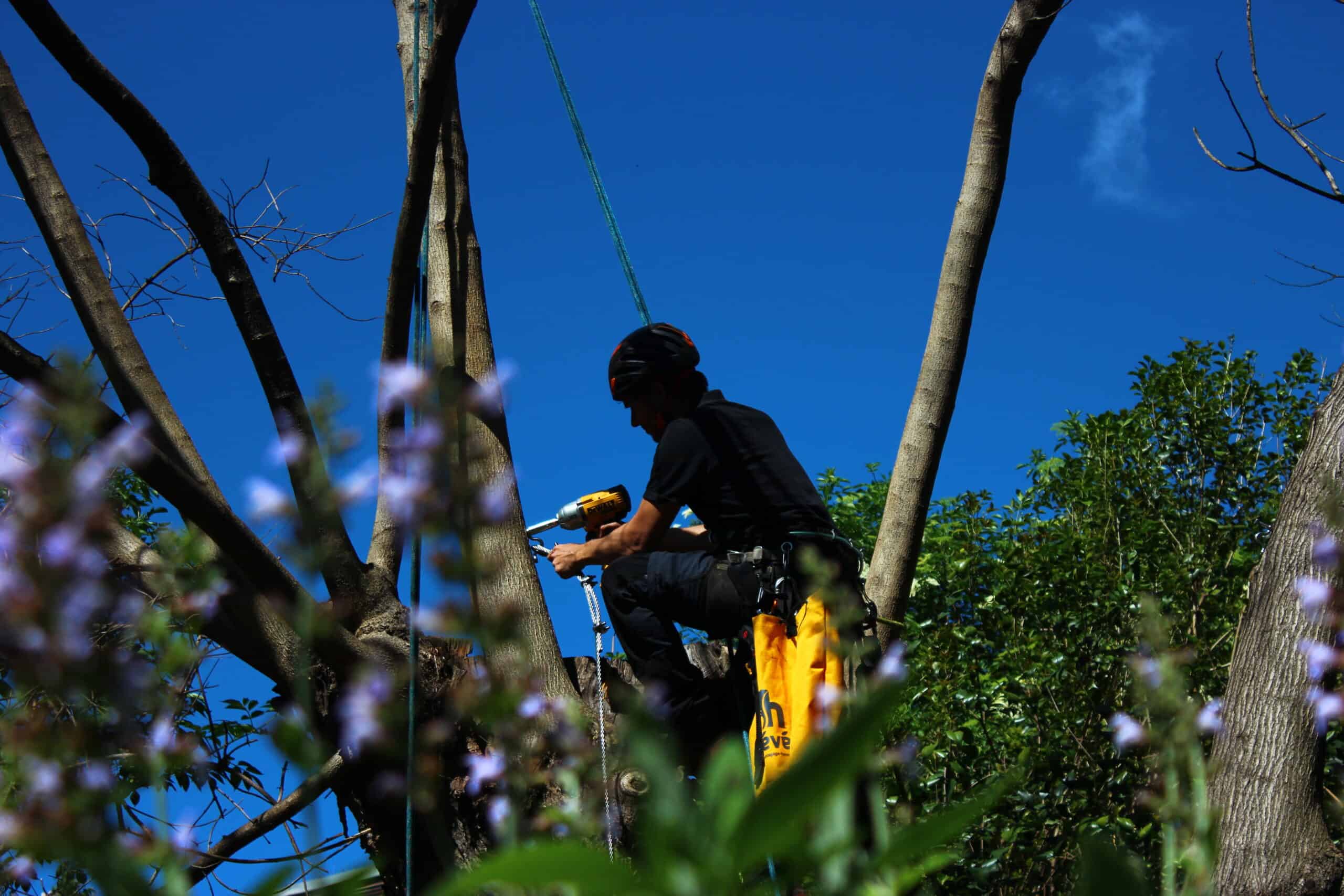 Suite à la rupture d’une branche charpentière sur ce vieux Sophora d’un jardin caché du cœur de ville (Montpellier), pose d’un système de haubanage actif et passif. Une ancienne verrière est une « cible » d’une des sections restantes.